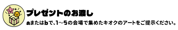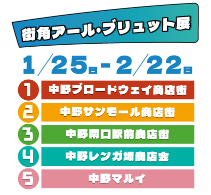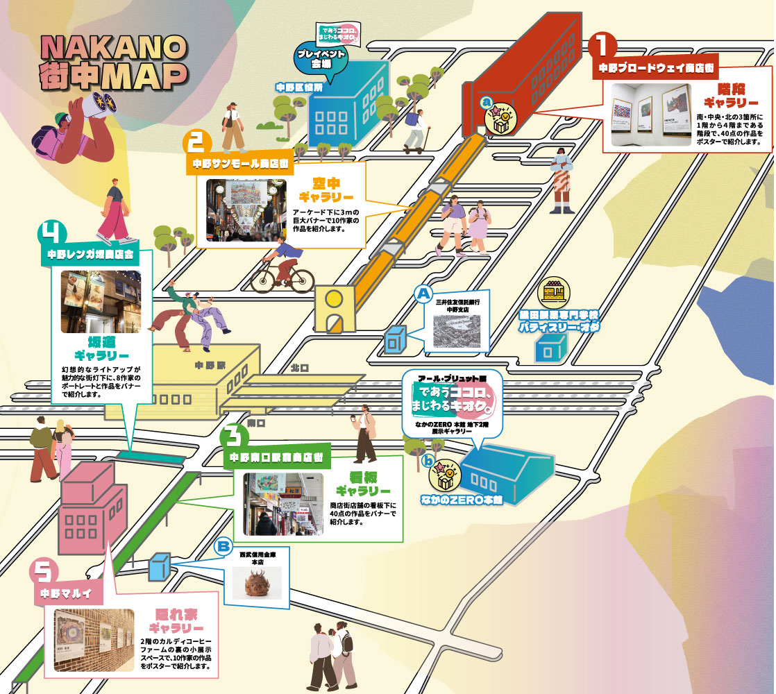 南・中央・北の3箇所に1階から4階まである階段で、40点の作品をポスターで紹介します。 アーケード下に3mの巨大バナーで10作家の作品を紹介します。 商店街店舗の看板下に40点の作品をバナーで紹介します。 幻想的なライトアップが魅力的な街灯下に、8作家のポートレートと作品をバナーで紹介します。 2階のカルディコーヒーファームの裏の小展示スペースで、10作家の作品をポスターで紹介します。 「街角アール・ブリュット展」①~⑤の各会場に、プレイベントの参加者が制作した作品が展示されています。作品を探して掲示されたQRコードを読み込んで、キオクのアートを5つ集めた方に、抽選くじでオリジナルグッズをプレゼント! A. 中野ブロードウェイ商店街振興組合 事務所(ブロードウェイ商店街 1F) 1月25日(日)-2月21日(土) 14:00~16:00(毎週水・1/25以外の日曜日、祝日を除く)B. アール・ブリュット展 会場(なかのZERO 本館 地下2階 展示ギャラリー) 1月31日(土)-2月19日 (木) 11:00~18:30