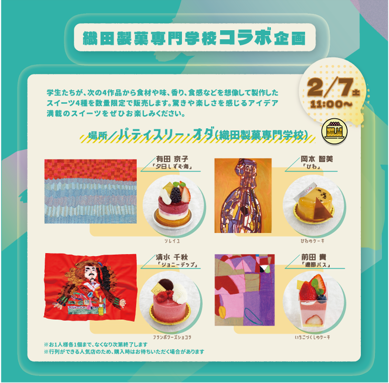 巨大なバナーや紙に好きなものや思い出を参加者のみんなで描くワークショップ。完成した作品は、「街角アール・ブリュット展」の5会場の一部に展示します。会場:ナカノバ ※要事前申込定員:開催時間中100名程度 ※参加者の状況により当日受付可 出展作家の岡本智美さんの公開制作。完成した作品は「アール・ブリュット展」会場内に展示します。会場:ナカノバ コミュニティーアーティスト・かてコト主宰の平澤咲さんと一緒に絵を描くワークショップ。完成した作品は「街角アール・ブリュット展」の5会場の一部に展示します。会場:シェアノマ ※要事前申込定員:開催時間中40名程度 ※参加者の状況により当日受付可 平澤 咲(ひらさわ さき)1990年- 八王子市出身女子美術大学大学院 日本画研究領域修了。コミュニティ・アーティスト/「かてコト」主宰、女子美術大学 ヒーリング表現領域 非常勤講師。文化施設や公共スペースにおける共創、アクセシビリティに取り組む。これまでに、都市公園にてボランティアや医療施設と連携した自然体験、視覚に障害のある人と楽しむ美術鑑賞など。東京郊外の八王子で福祉施設に勤務しながら、障害のある人とない人のあそび・学びの場「かてコト」を立ち上げる。 申し込みフォームからお申込みいただくか、裏面の「お問い合わせ先」よりEmailまたはお電話にて次の①~⑦をご連絡ください。① お名前、②メールアドレス、③電話番号、④参加人数(付き添いの有無)、⑤希望参加時間、⑥障害の有無、サポートが必要な場合はその内容、⑦広報等での写真撮影の許諾の可否 申し込みフォームはこちら ナカノバの会場内にはマルシェで購入いただいた商品を飲食したり、おくつろぎいただけるスペースを設けます。 地元の飲食店、専門学校、障害のある方が働くカフェなどが出店。新鮮な野菜や素材にこだわったお弁当、パンやスイーツ、コーヒーなどが楽しめます。会場:ミーティングルームB 出店 大樹地農園 農薬・化学肥料不使用の朝採れ野菜を生産者が直売 daikichi-farm.com daikichi_farm daikichifarm Nine Baked Umeya / 梅家 いなり寿司や巻物、無添加の米粉やきび砂糖を使ったシフォンケーキなどを販売 @umeya_nakano 桃園食堂 中野南口にある桃園食堂から野菜をコンセプトにしたお弁当を販売 ひみつきちコーヒー 中野や動物アーティストコラボパッケージのンゴロンゴロ自家焙煎コーヒーを販売 himitsukichi-coffee.square.site @himitsukichi.coffee himitsukichi.coffee パティスリー・オダ / ケーキ工房Palette / てづくりシフォンケーキFuu 織田製菓専門学校の学生が運営するパティスリー・オダと卒業生のお店が共同出店 seika.oda.ac.jp @odaseika @palette2013 @chiffoncake.fuu ふらっとカフェ 手作りパンが自慢のカフェが添加物を極力使わないパンを販売 aisei.or.jp @aisei.isay aisei.isay 結の会 こだわりのジャムや手すきの和紙製品、アート作品を販売 npoyuinokai.sakura.ne.jp @npoyuinokai npoyuinokai 過去のコラボ映像はこちらからご覧いただけます▼